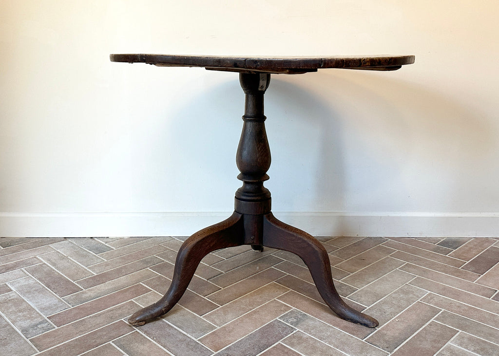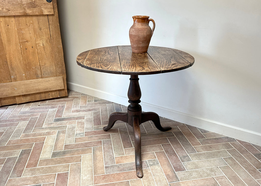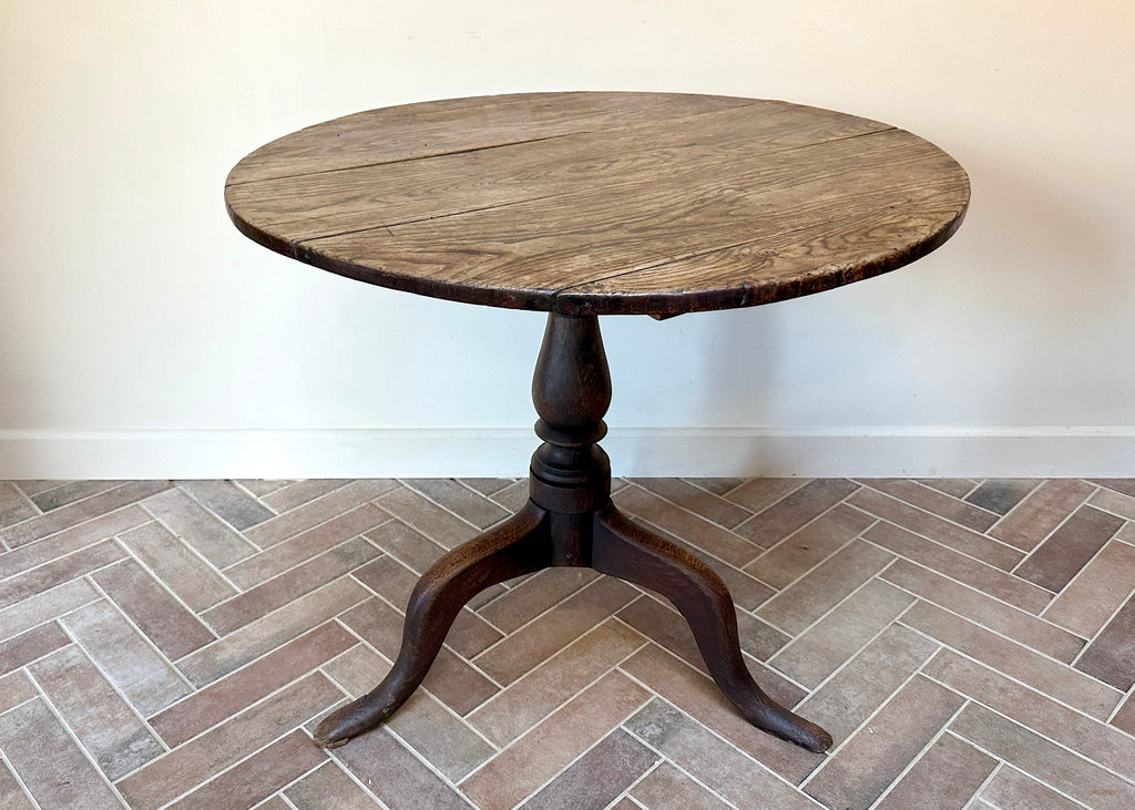 This Georgian dining table has an planked Elm top and turned Oak stand jointed together with three splaying feet.