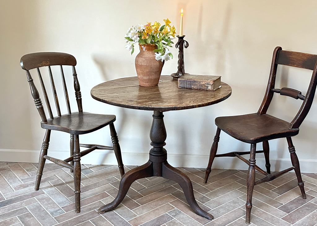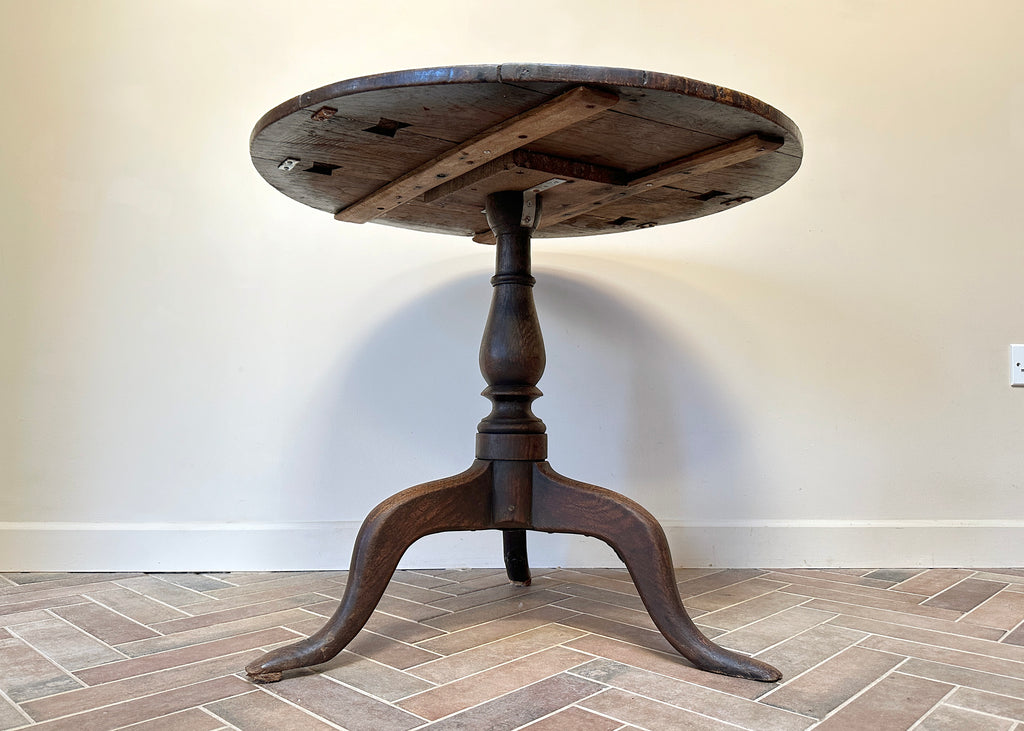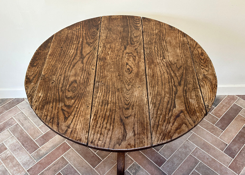 The striking Elm top has developed a lovely patina from many years of use- I believe this was once a tilt top table but has since been fixed in place.