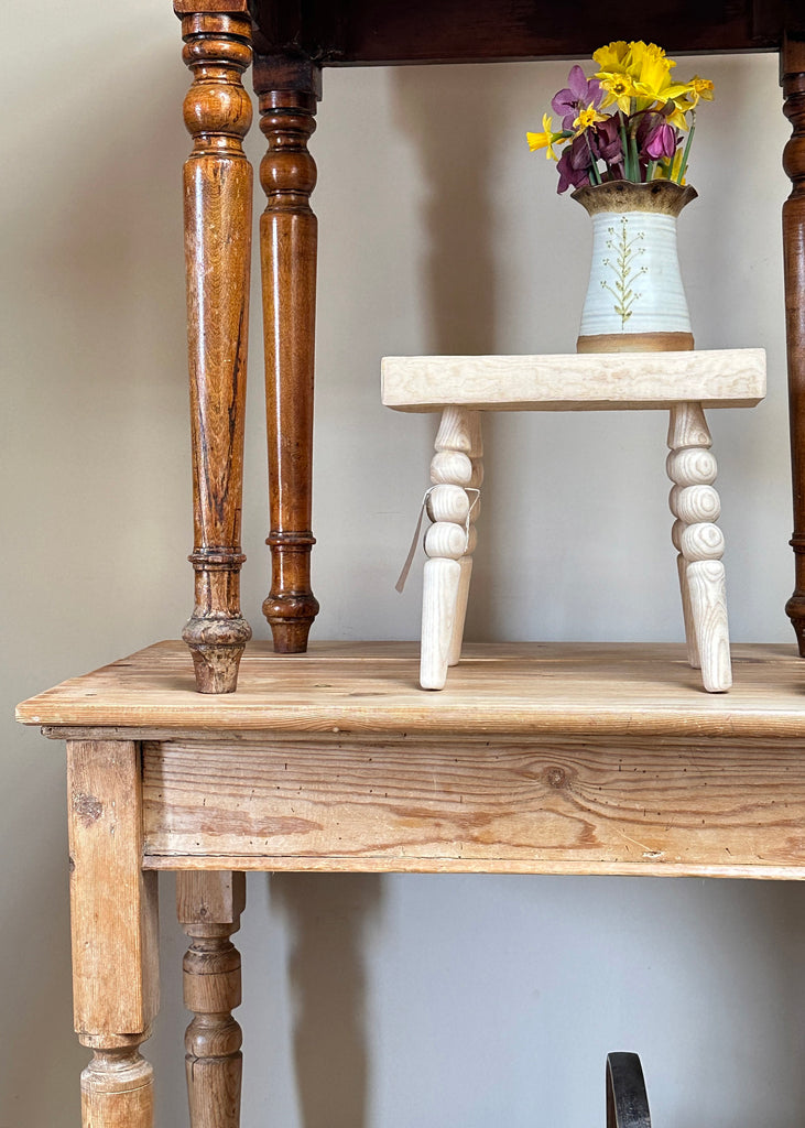 A beautiful piece for any home, this sturdy stool has been crafted out of Ash wood, with tapered bobbin legs and the original saw marks across the top- making this incredibly tactile.