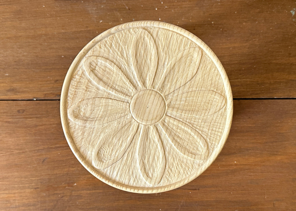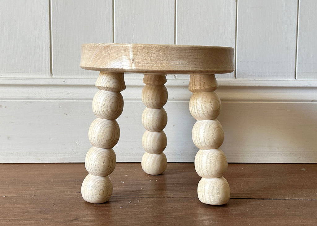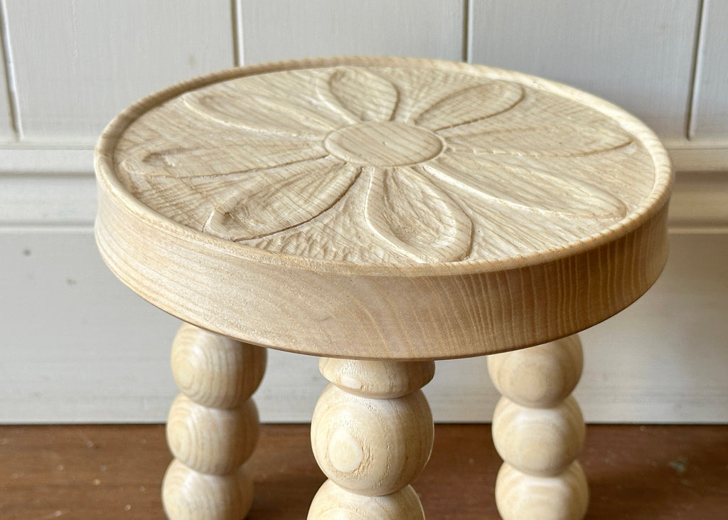 Crafted out of a light Ash wood, this beautiful little footstool has a daisy hand carved into the top and three turned bobbin legs- this has been buffed with a natural beeswax.