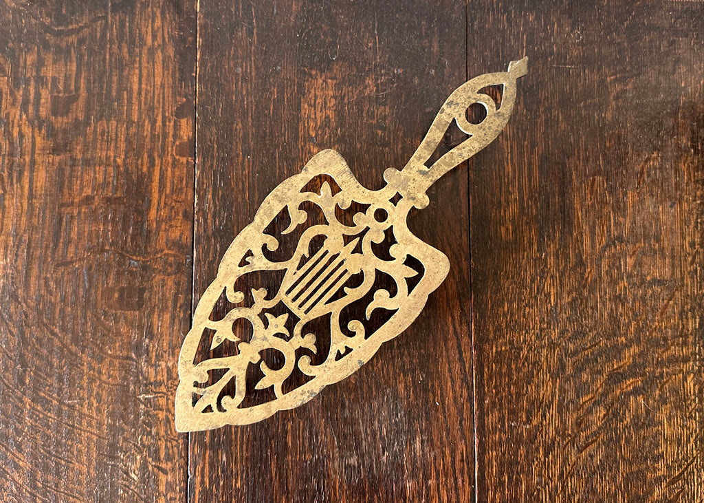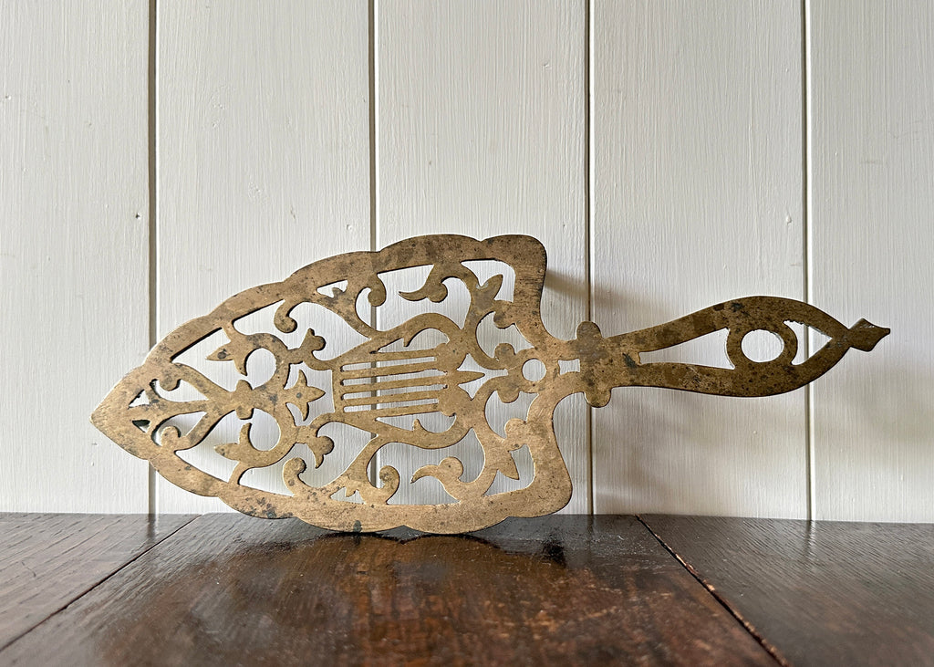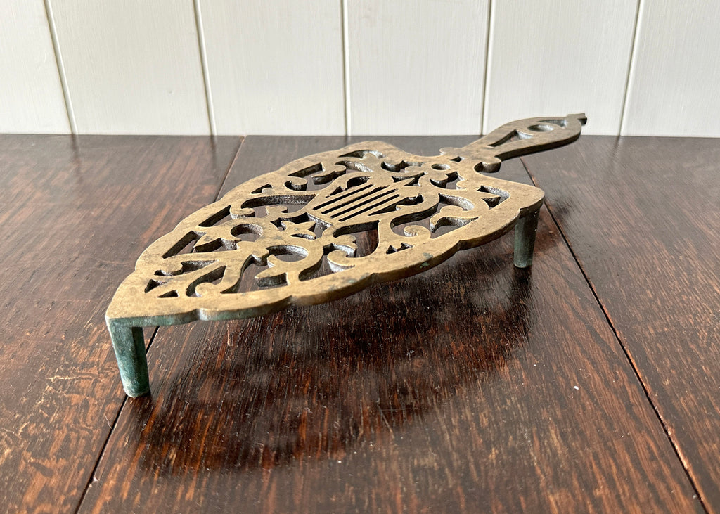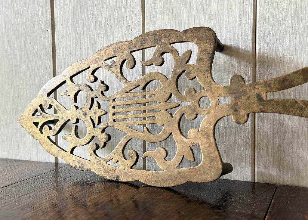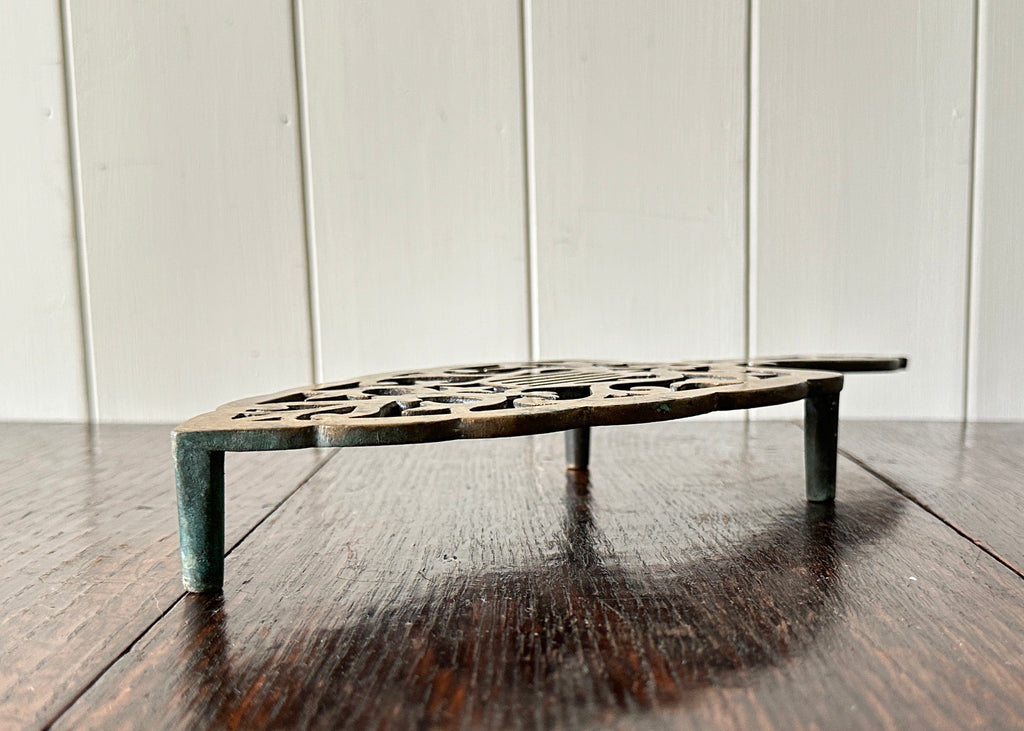 Sat upon three feet, this ornate trivet has been made out of cast brass, which has developed a striking patina from many years of use.