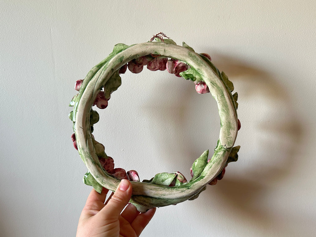 One of a kind, this beautiful ceramic wreath features lots of pink flowers nestled amongst the leaves, the glossy glaze has a muted tone throughout.