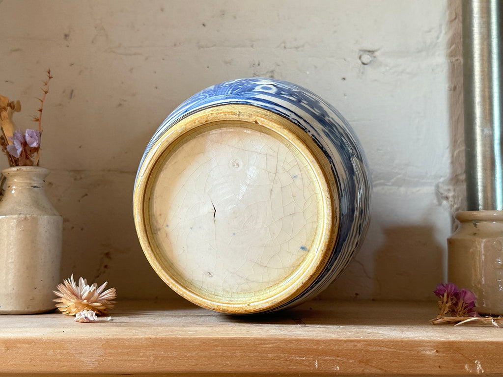 A beautiful example of Chinese Pottery, this antique ginger jar has a delicate painted glaze, mustard yellow rim and hatched top- this is typical of Qing Dynasty jars, which date from 1644 - 1911.