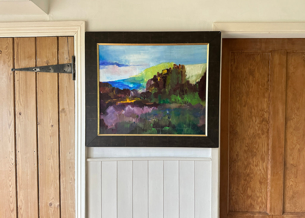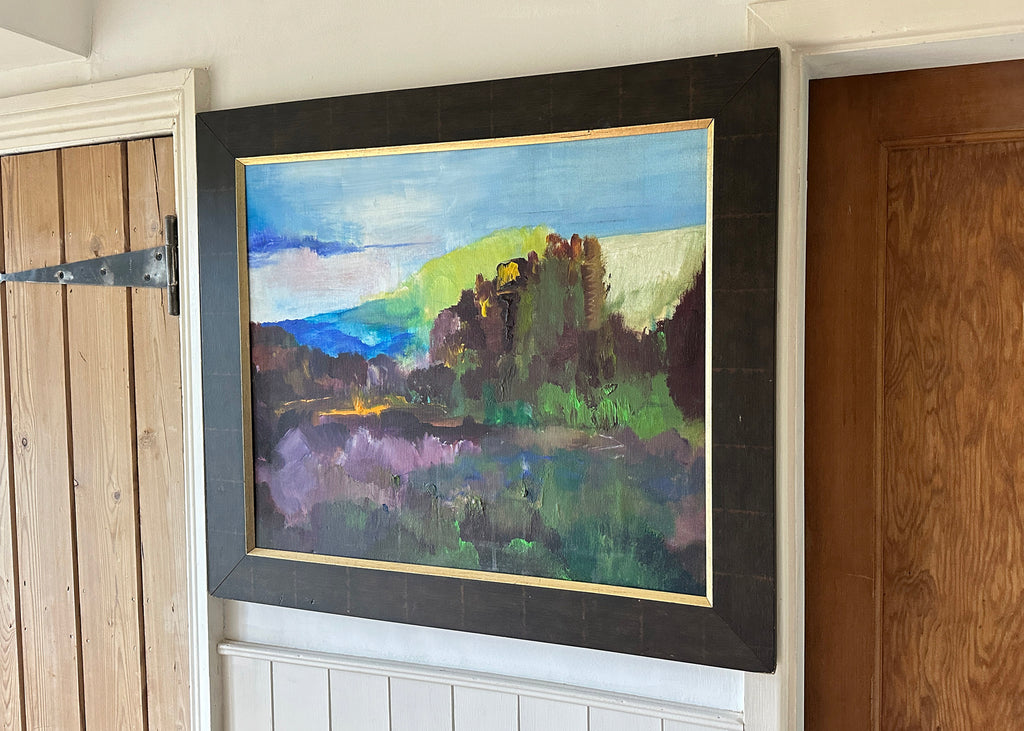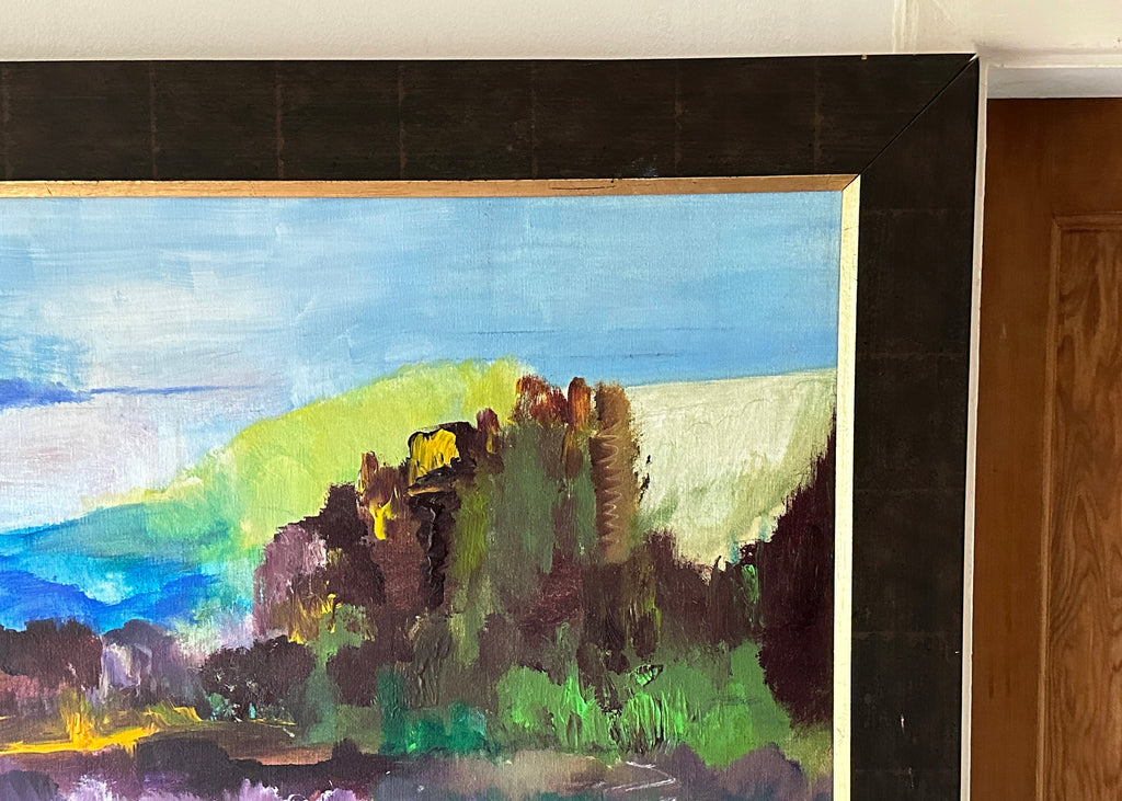 Large in size, this abstract oil painting features a colourful landscape created onto a stretched canvas, sat in a black frame with a gold inner trim.