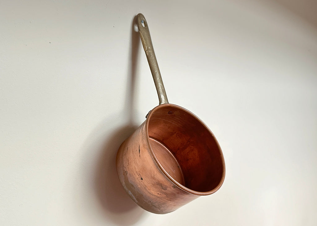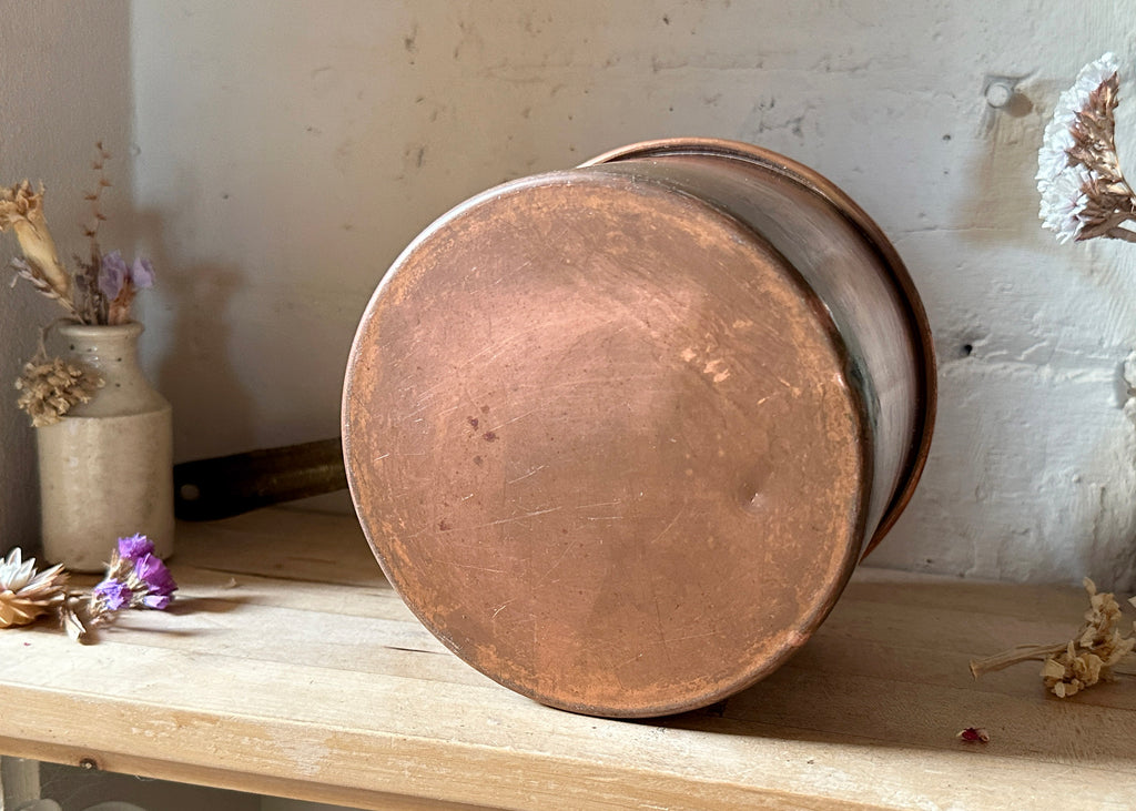 This lovely little copper saucepan has a cast brass handle, with small hole for hanging, and a subtle patina throughout.