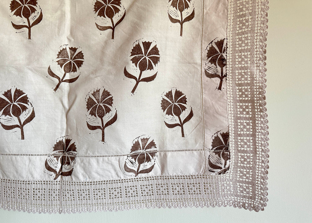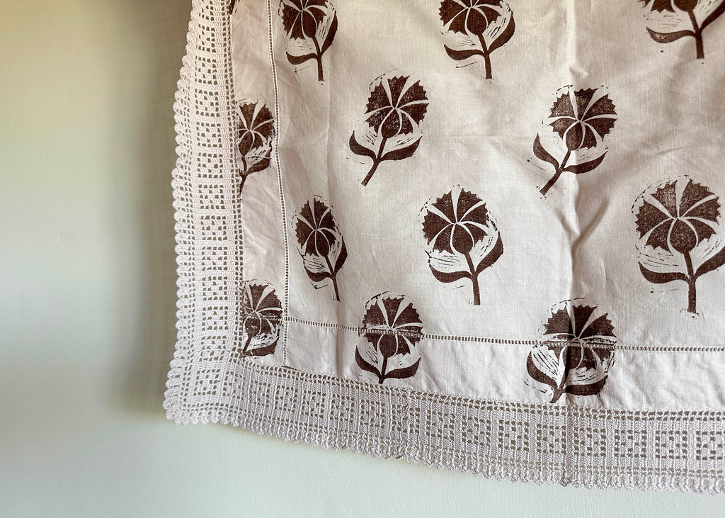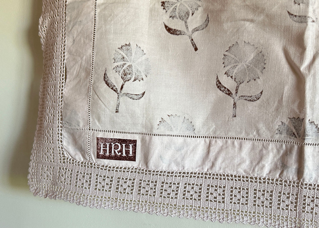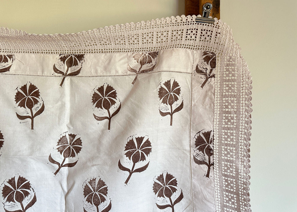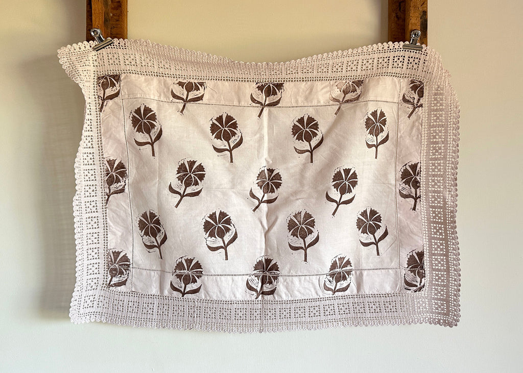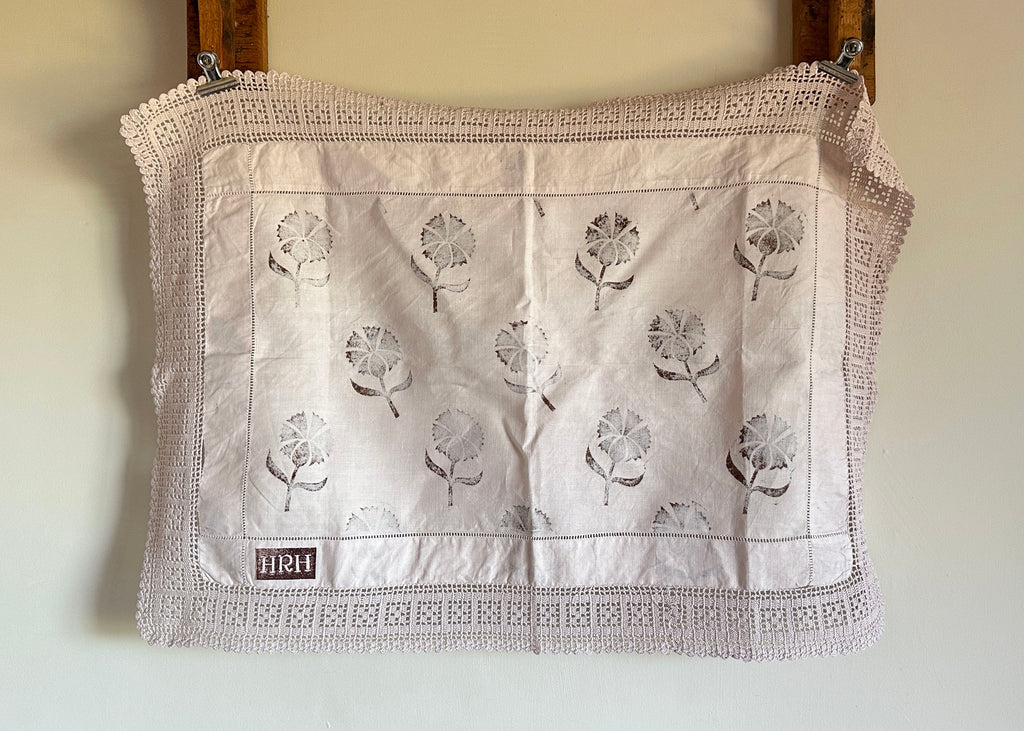 This old linen tray liner, with a lace trim, has been dyed a pale pink and hand printed with my lino block Cornflower in a deep brown.