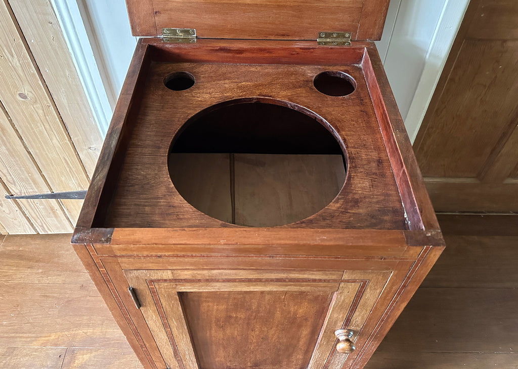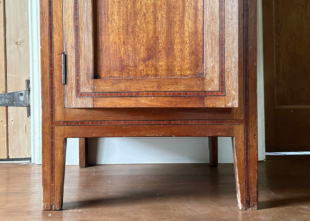 Circa 1910, this beautiful old wash stand has a simple in-lay detail to the front, the door is hinged on the left with a small turned knob and the top lifts up to reveal the original basin holder.