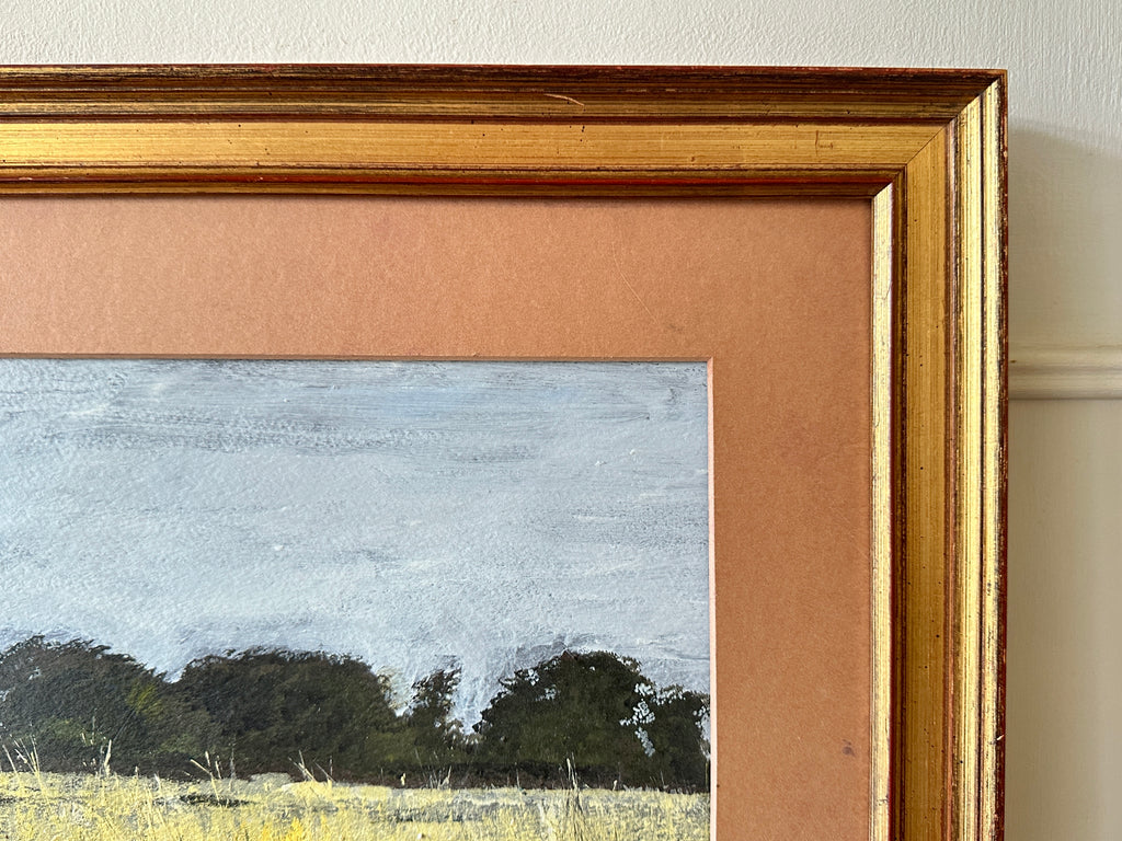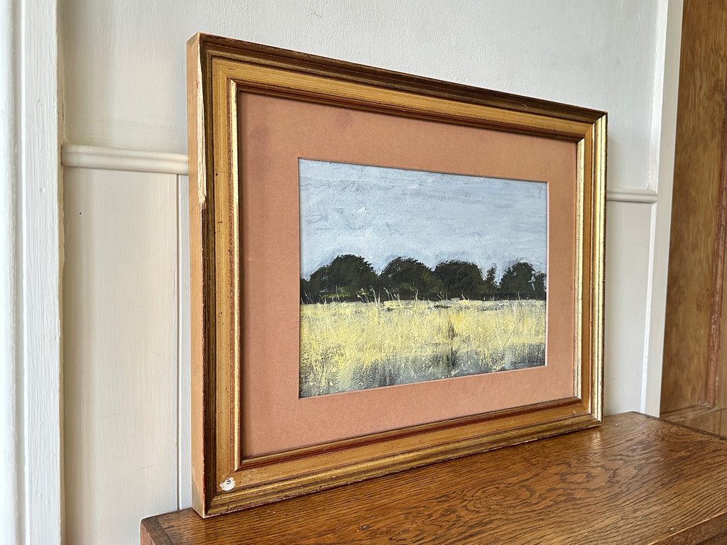A beautiful Plein Air piece, this original oil painting depicts a wheat field with a row of trees behind and a muted blue sky- this has been created on a textured board.