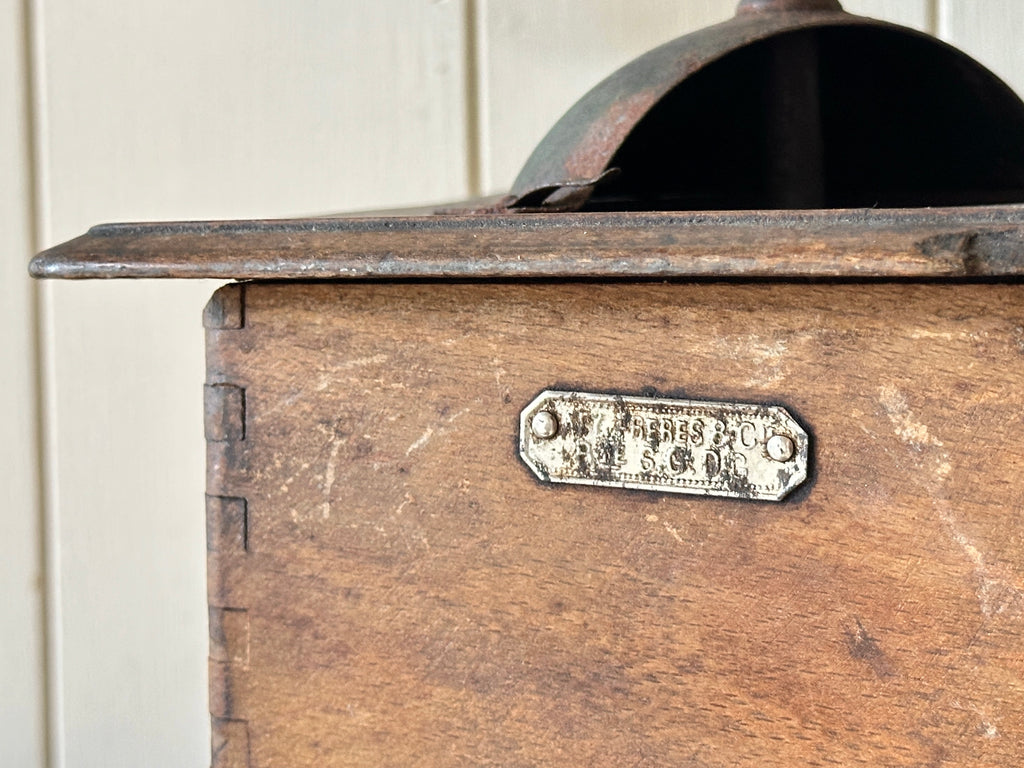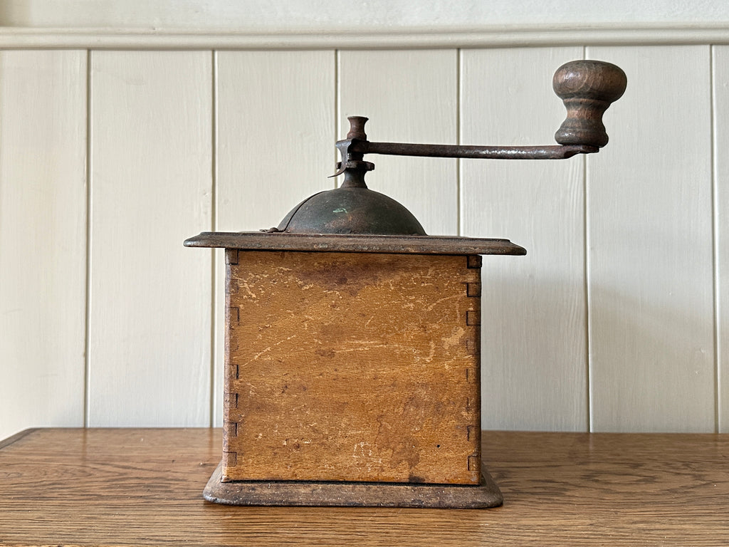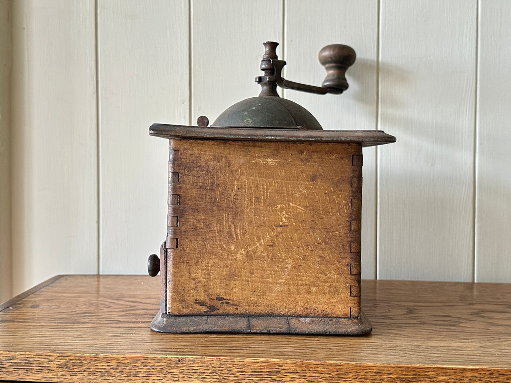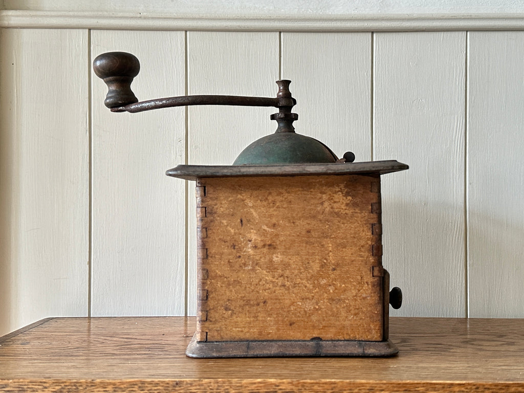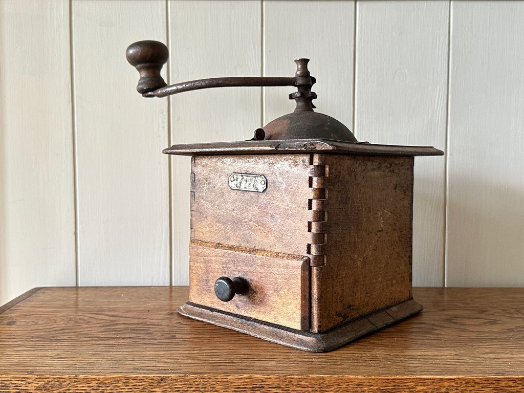 Circa early 1900s, this beautiful coffee grinder has a manual handle, dovetail jointed sides and slim drawer to collect the ground beans, and it is fully functional- I've tested it!