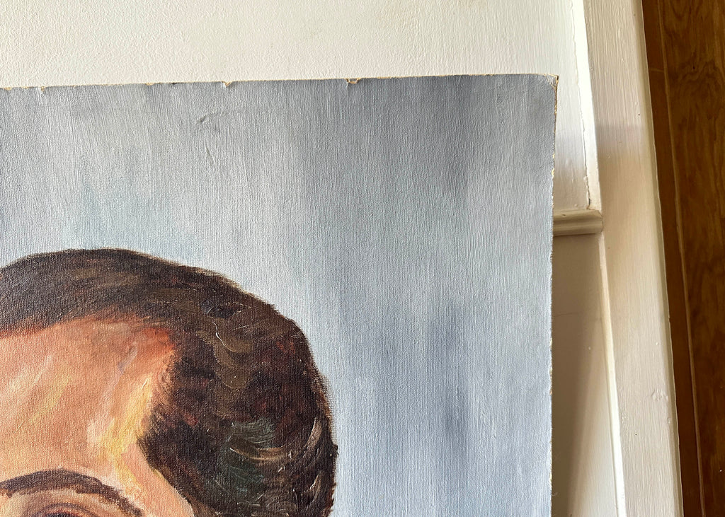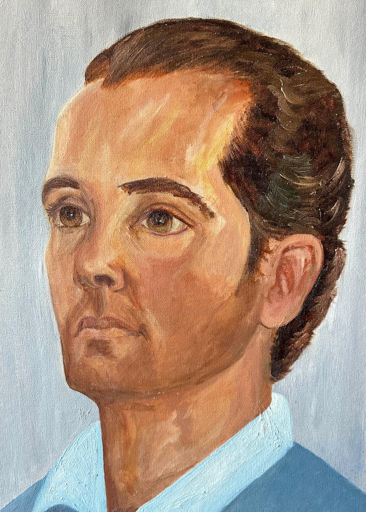 Large in size, this imposing oil painting has been created onto a board and depicts a portrait of a man with brown hair wearing a blue shirt against a blue background.