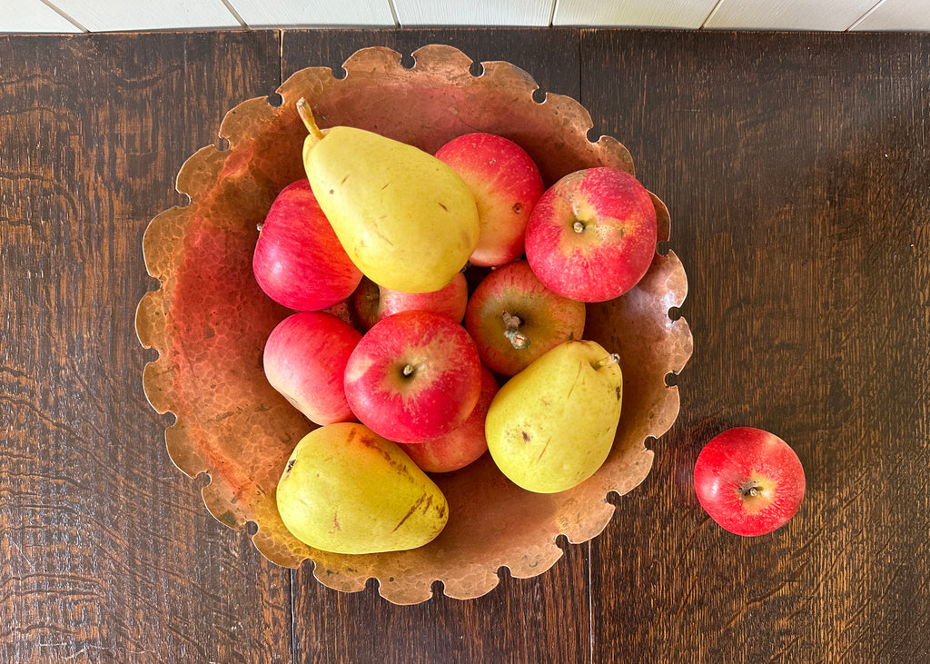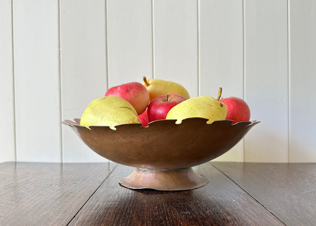 Full of Arts & Crafts charm, this hand made copper fruit bowl has a striking scalloped edge and unique patina throughout. I have lightly buffed the copper revealing the pretty hammered detail inside.