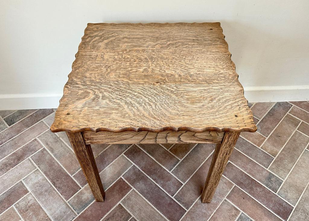 Full of Arts & Crafts charm, this antique side table has been crafted out of a light oak, has a square top, with fluted edge and straight legs.
