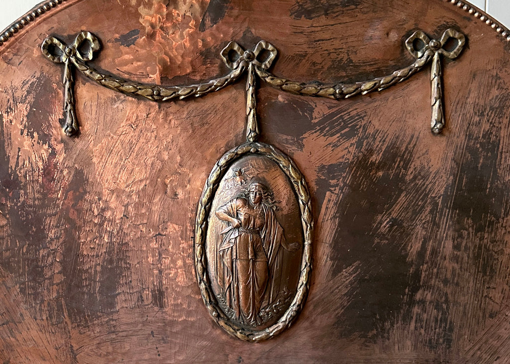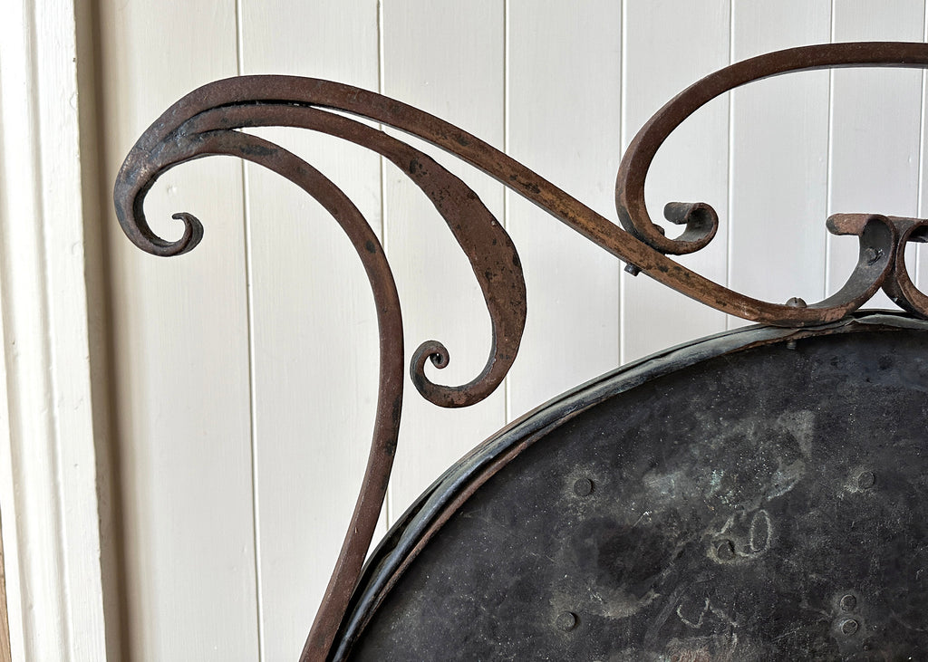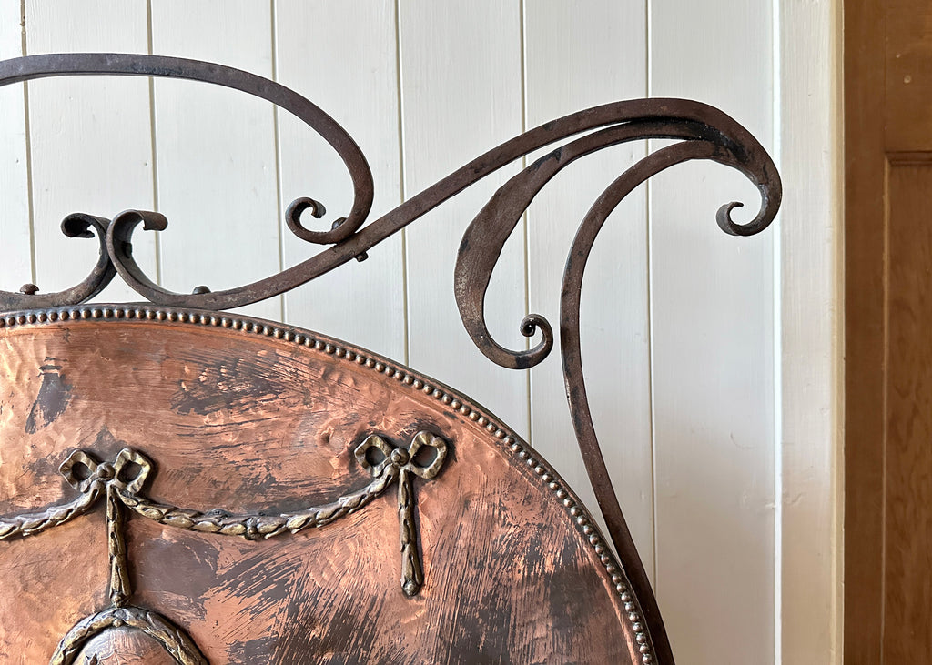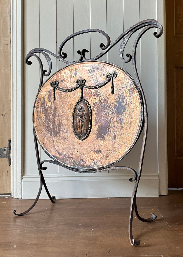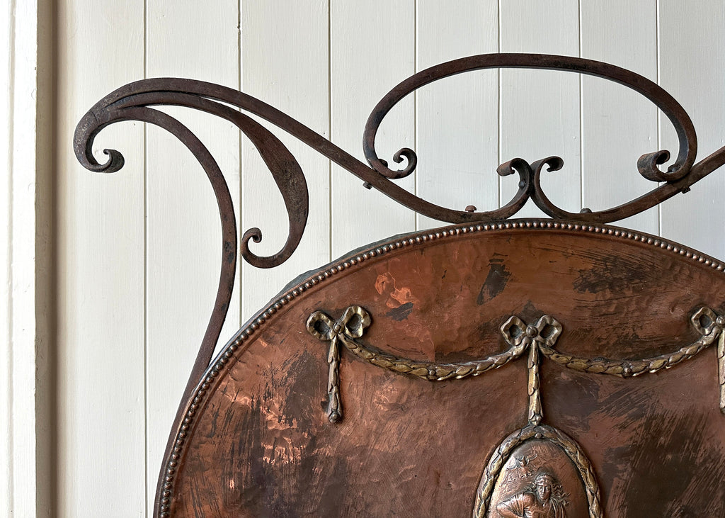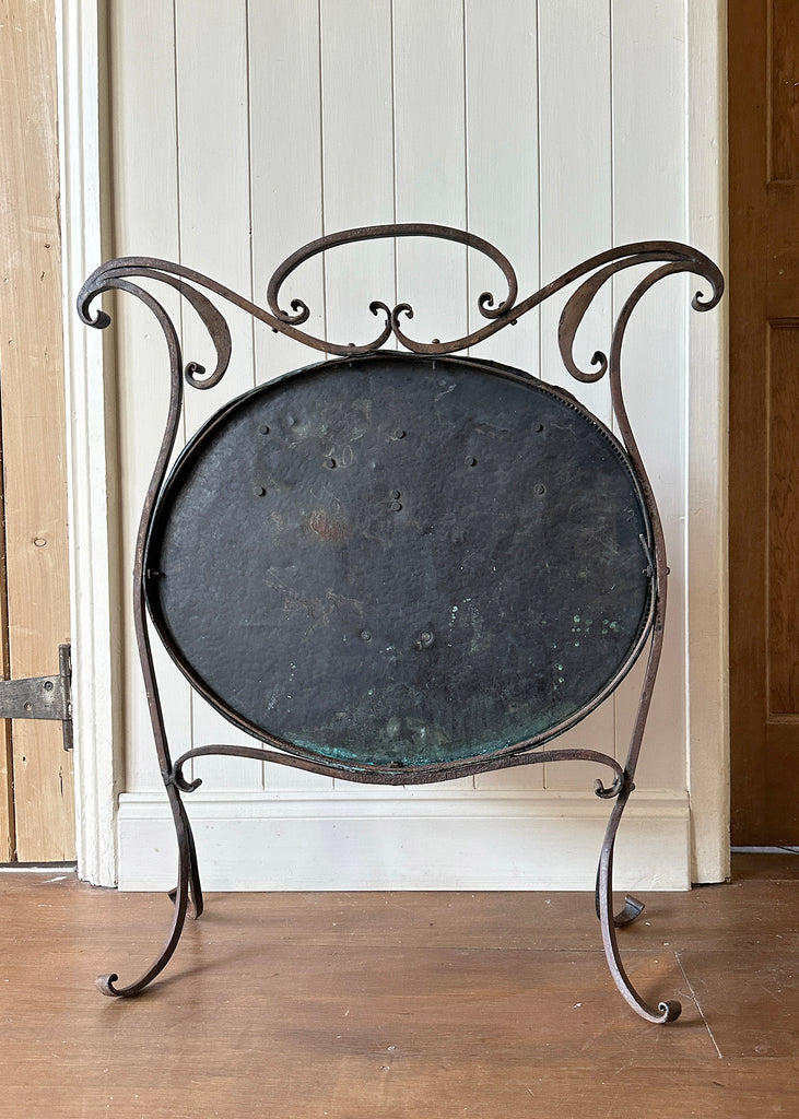 Circa 1870, this antique fire guard has an ornate wrought iron frame, splayed legs and a beautiful tinned-copper plate which has developed a striking patina over the years.