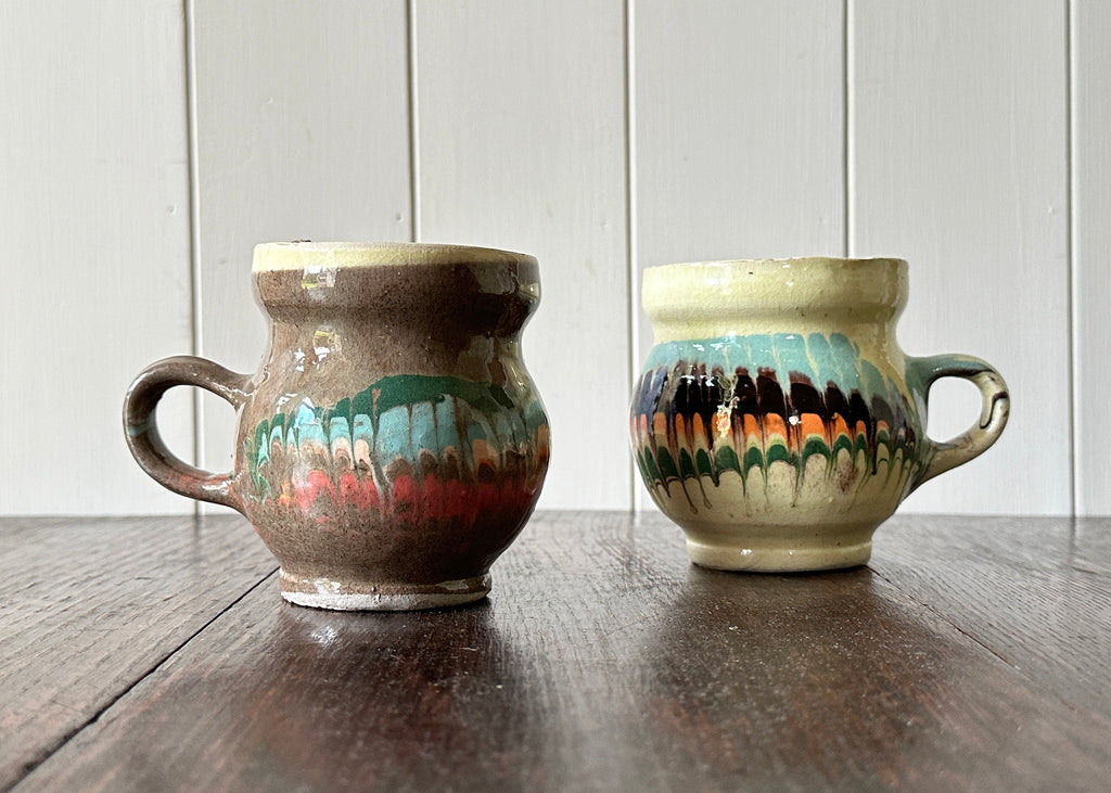Crafted in Romania, these beautiful slipware mugs have a colourful 'pulled glaze' and are sold as a 'mix and match' pair- one has a brown base and the other a buttery yellow.