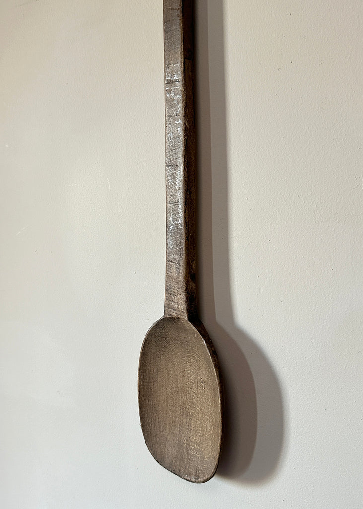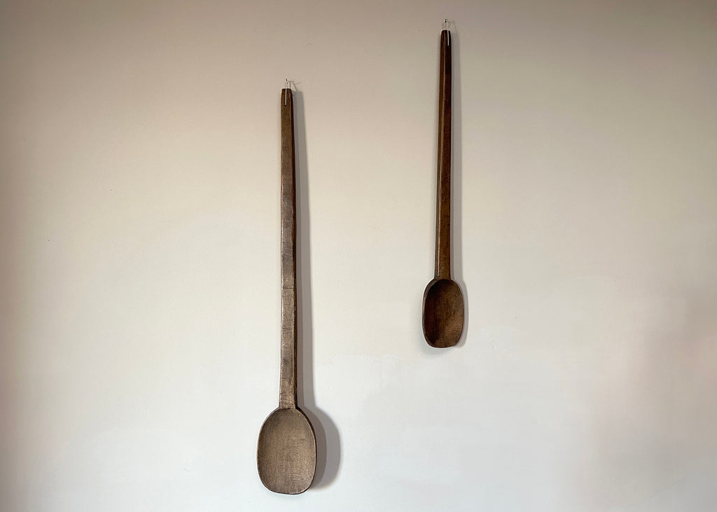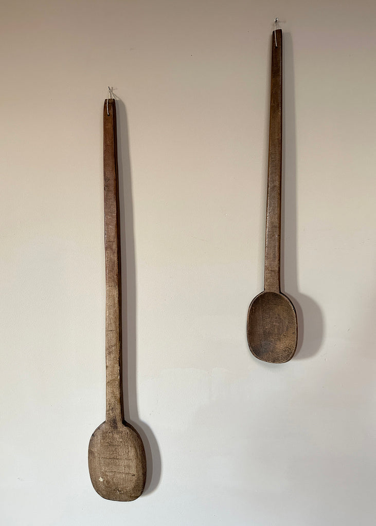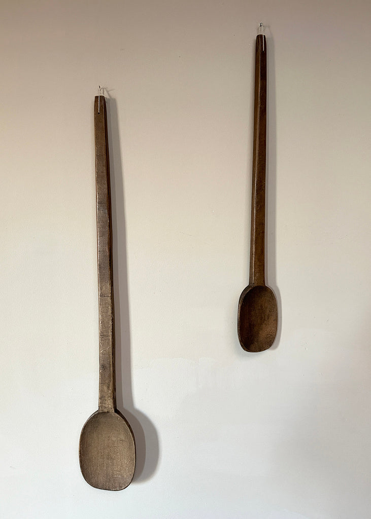 Sold as a pair, these beautiful long handle spoons have developed a striking patina from over the years- each has a small hole at the end for hanging on a wall, but would look as great placed in a large vase.