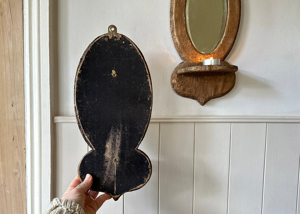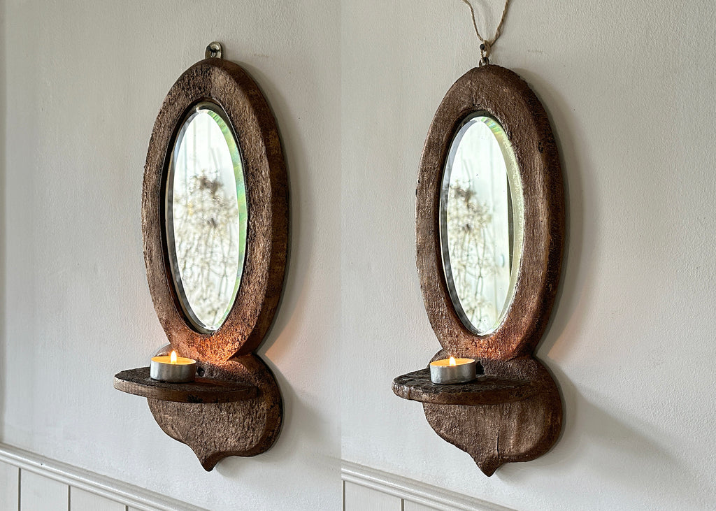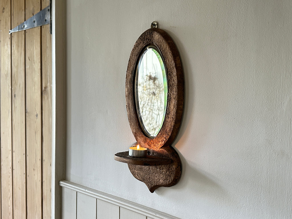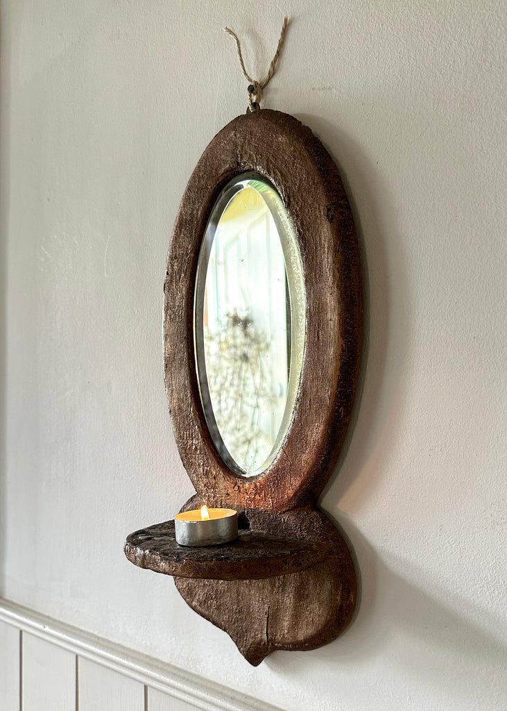 A lovely piece of vintage decor for any home, these old mirror sconces have a textured frame that is painted copper- with a shelf underneath, perfect for holding a candle.