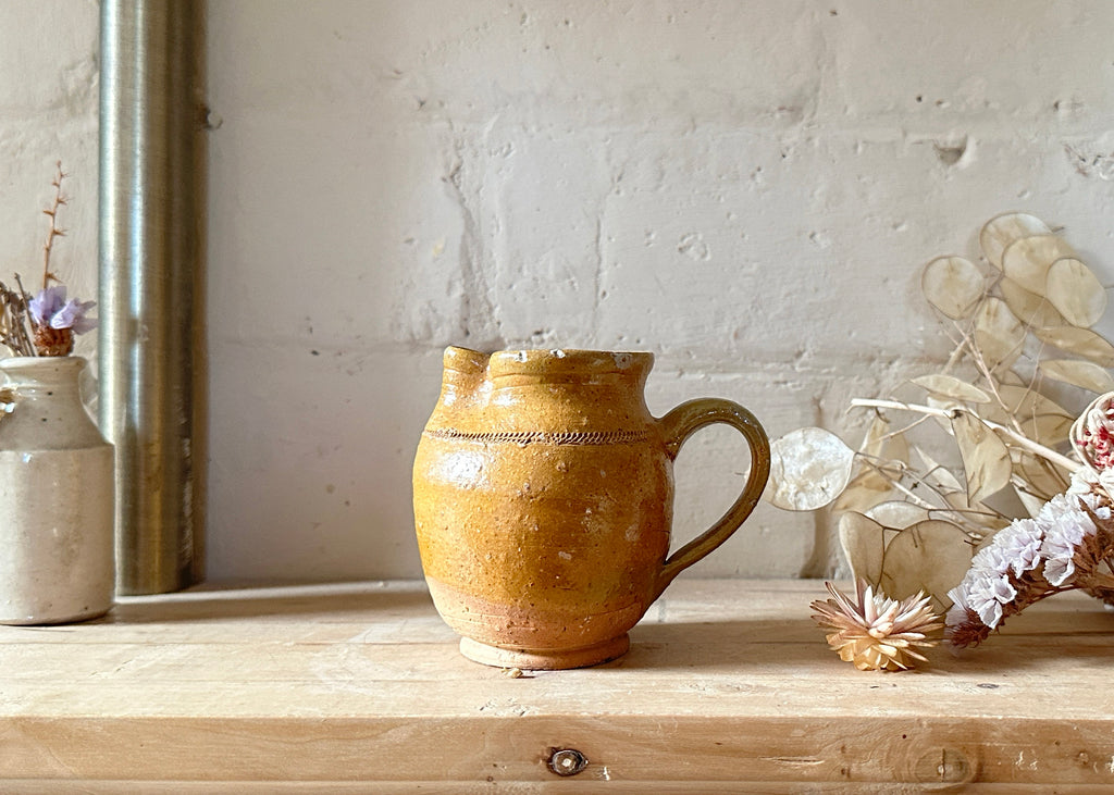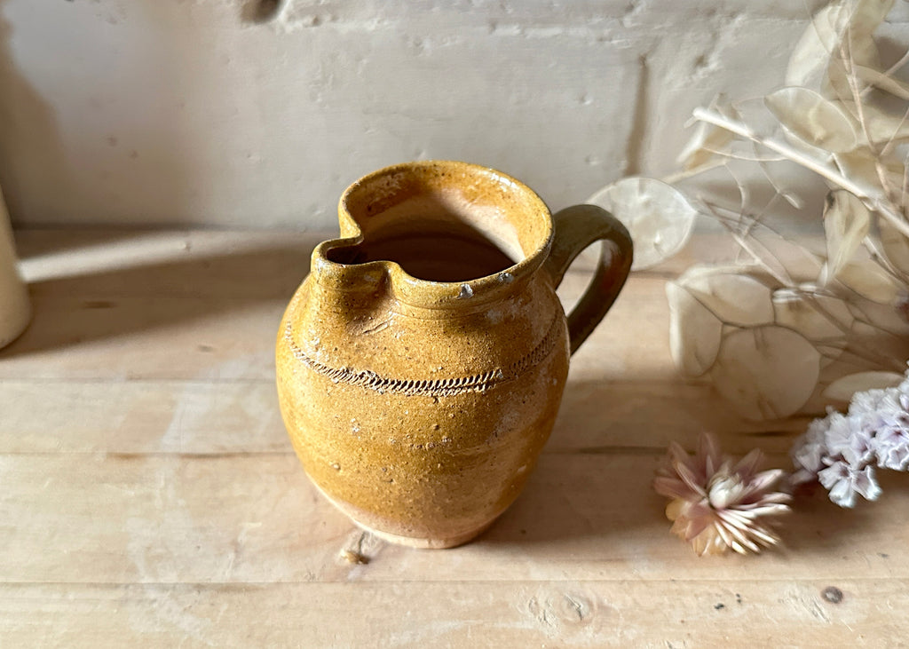 This lovely little milk jug has been handmade out of clay, has a scored detail around the neck and traditional mustard yellow slip-glaze.
