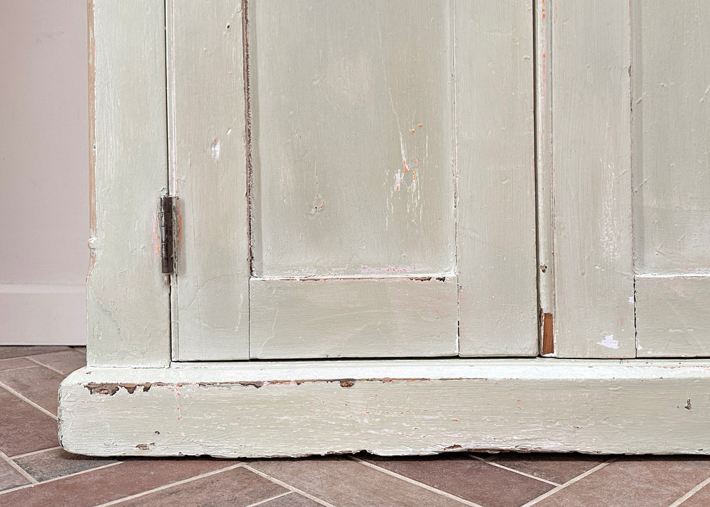 Circa 1860s, this beautiful scullery cupboard is made from pitch pine, which has been painted a muted green many years ago- this has a lovely timeworn patina throughout.