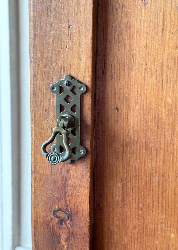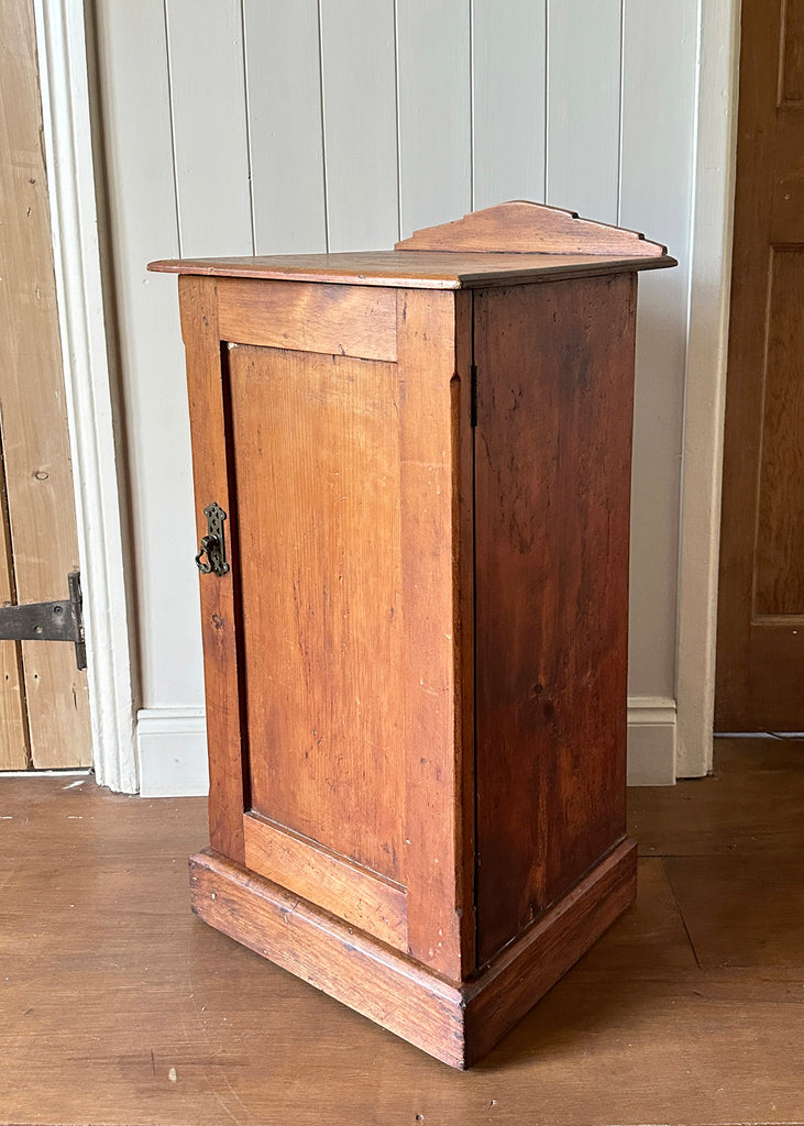 This pitch pine cupboard has developed a lovely patina over the years- In very good condition, the shaker door is hinged on the right, with a sturdy brass pull and single shelf inside.