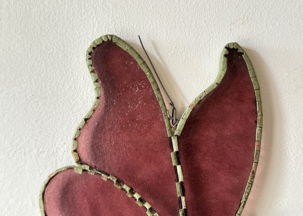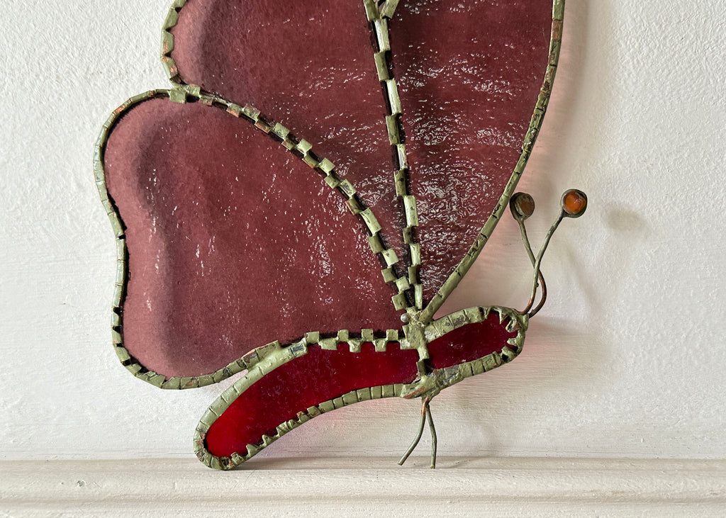 This is a red stained glass butterfly suncatcher. It is a handmade decorative item, often created using the copper foil technique, and is designed to be hung in a window to catch the light.