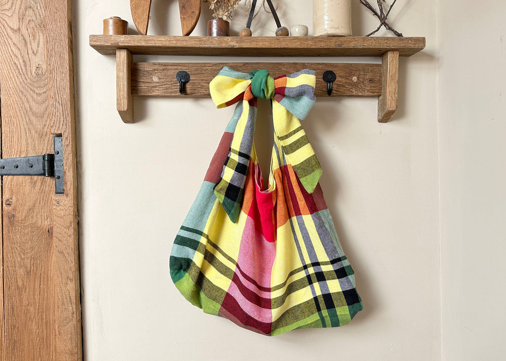Handmade, I have repurposed a vintage tablecloth, made up of green and red checks on a yellow base.