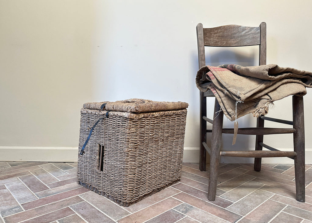 This sturdy wicker basket has a hinged lid with a handle and small window to the front- in good condition, the strap no longer secures the lid with the buckle but can be tied instead.