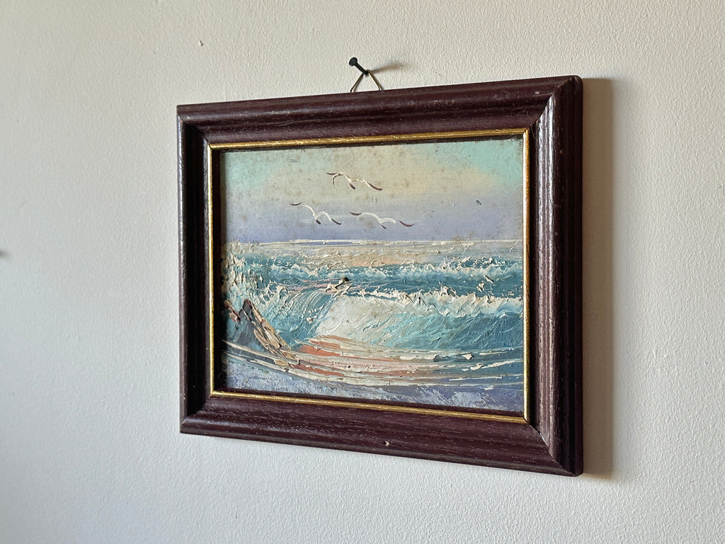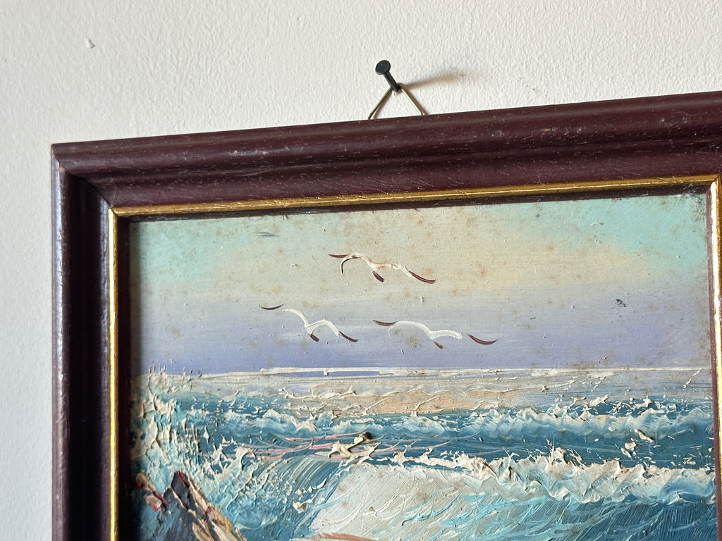 Ever so sweet- this charming little oil painting has been created onto a piece of board and depicts an impasto style sea, faded sky with three birds flying in.