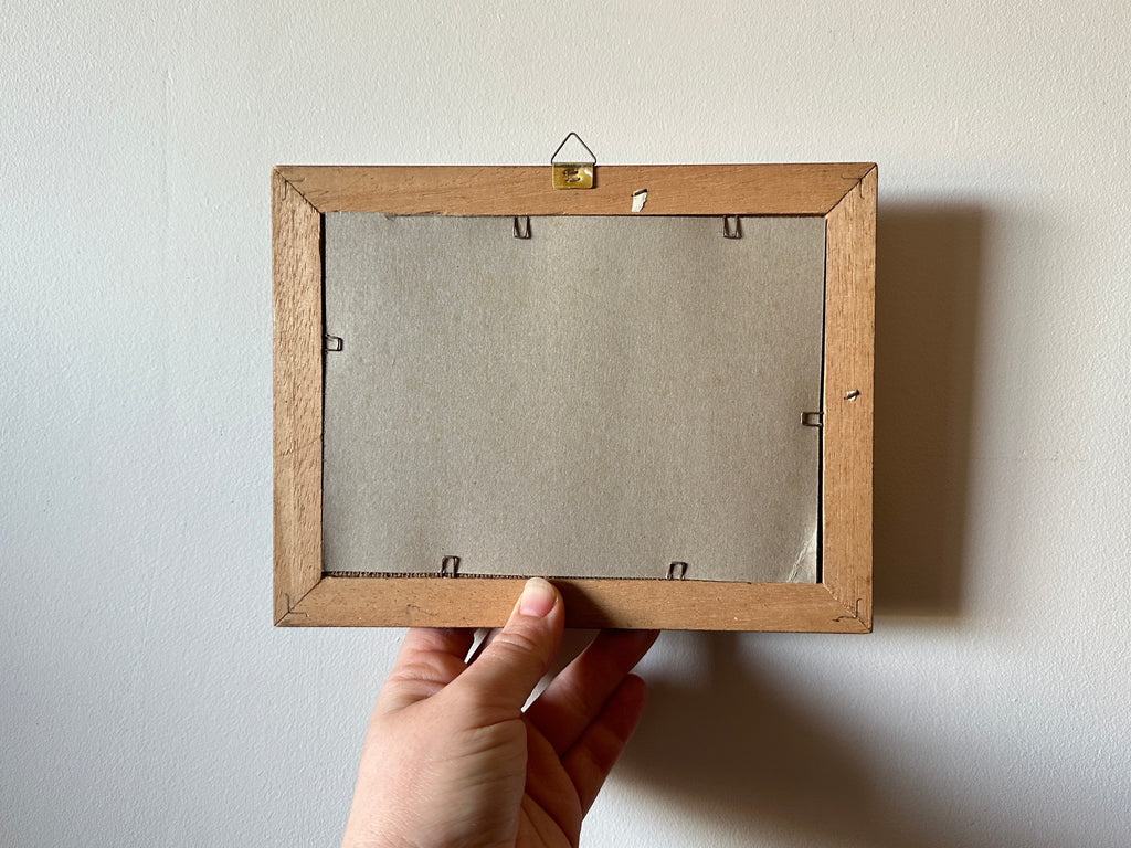 The simple wooden frame has a gold detail, a hook on the reverse for hanging and there is some historic staining to the artwork (shown).