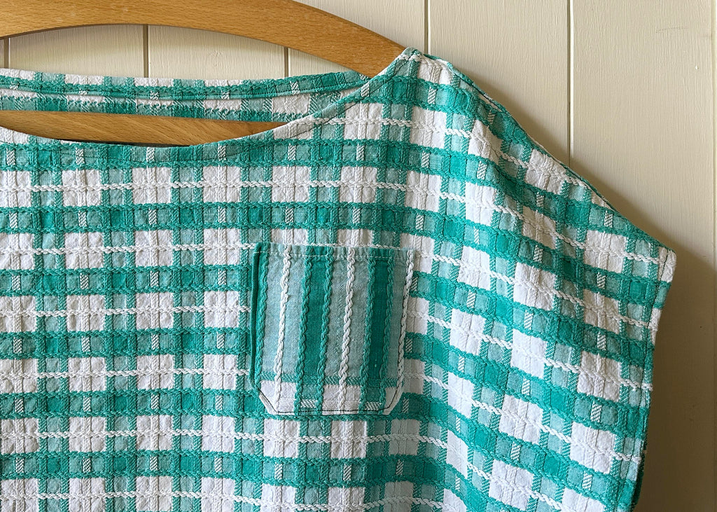 Created out of a vintage checkered table cloth, this beautiful crop top has short capped sleeves, a small breast pocket and it is one of a kind.