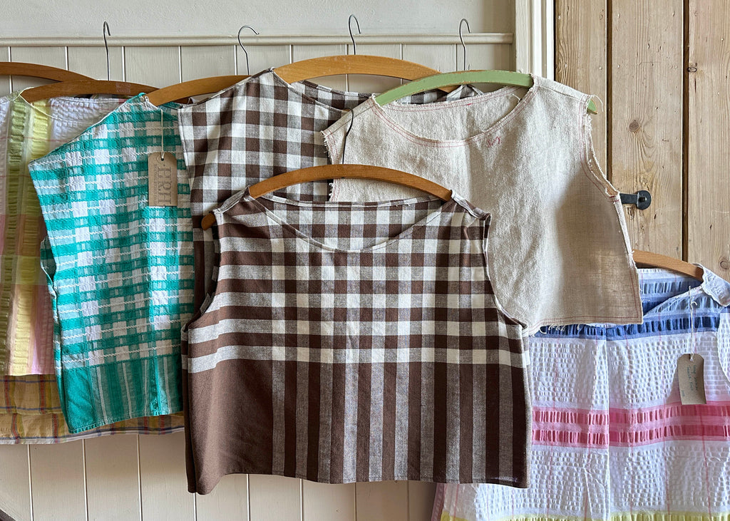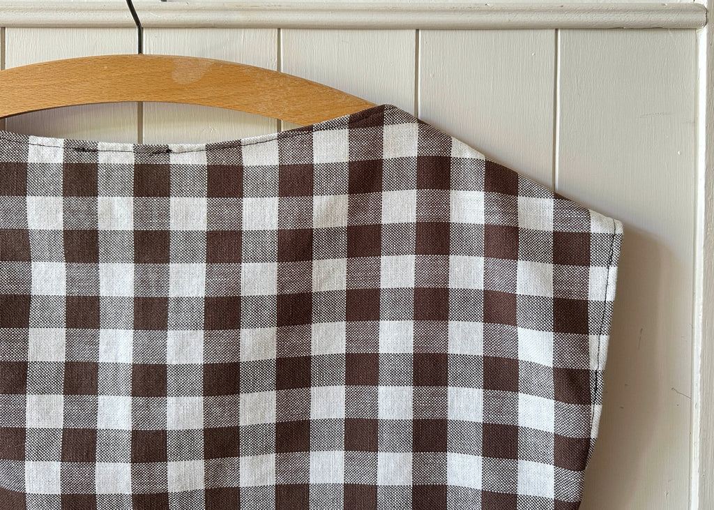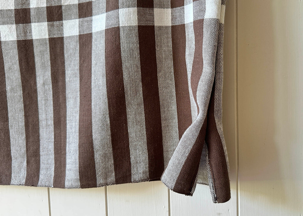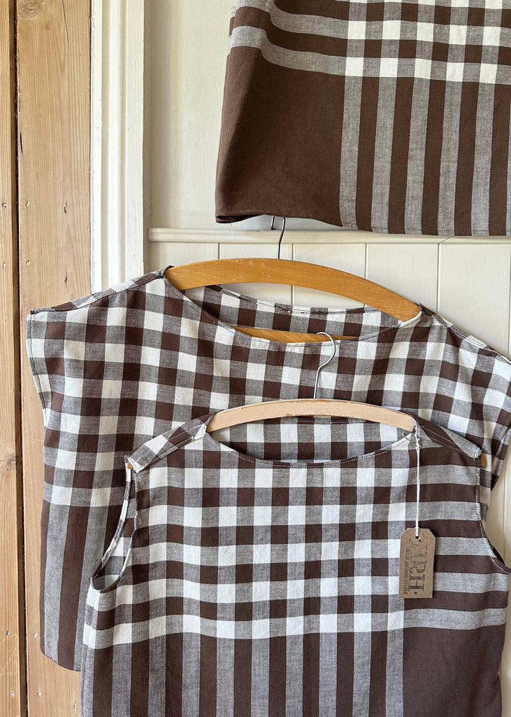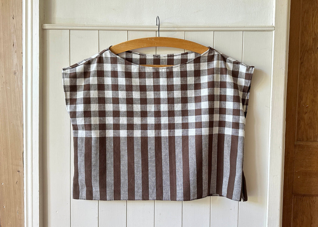 Created out of a vintage brown and white gingham table cloth, this beautiful boxy top, has short capped sleeves, a wide neck, side slits- it is slightly cropped and is completely unique.