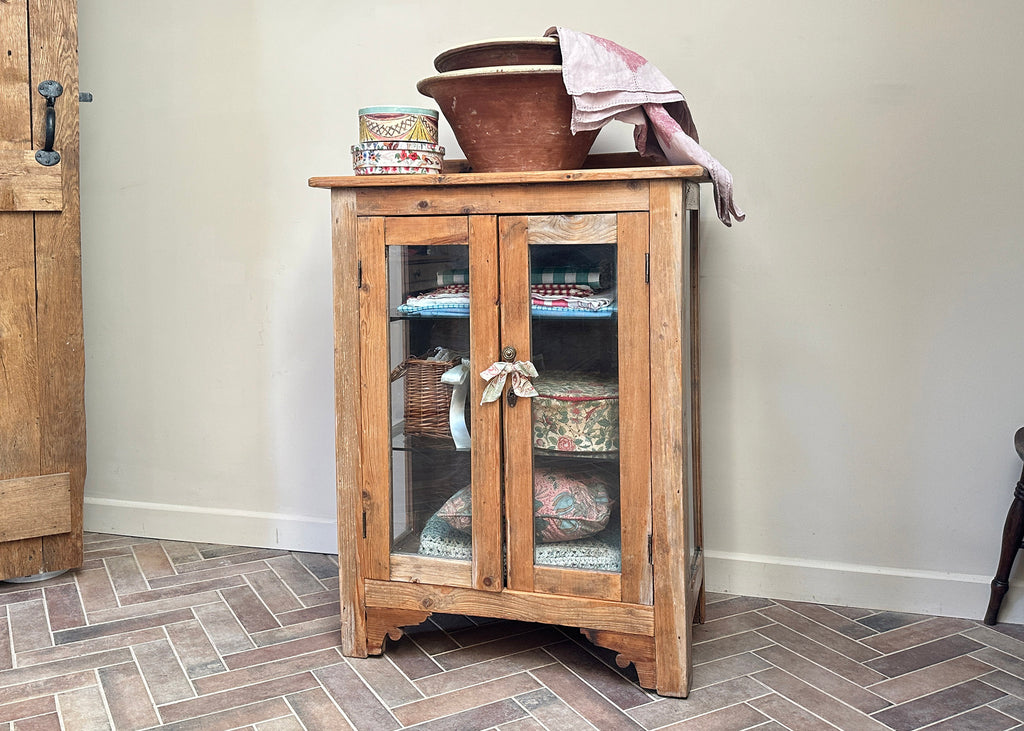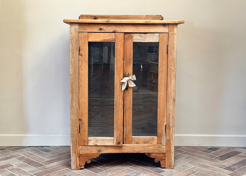 Circa early 1900s, this beautiful, antique cupboard is made from stripped pine and toughened glass. There are two slim glazed doors to the front, inside the left door is a latch to secure this shut and on the right the original lock and key.