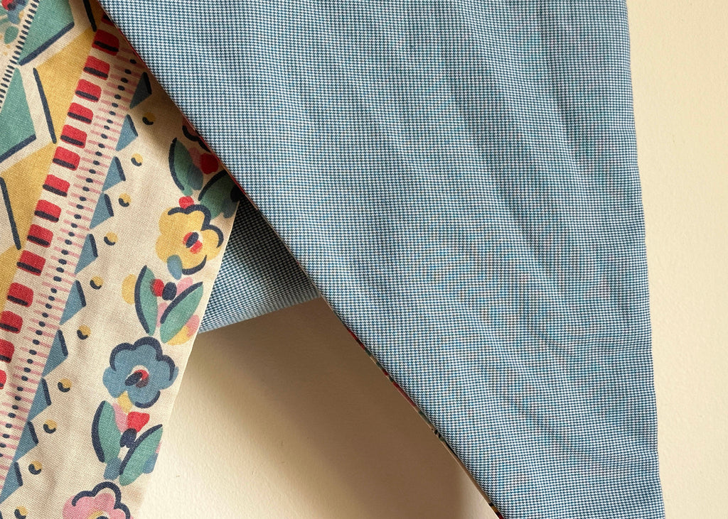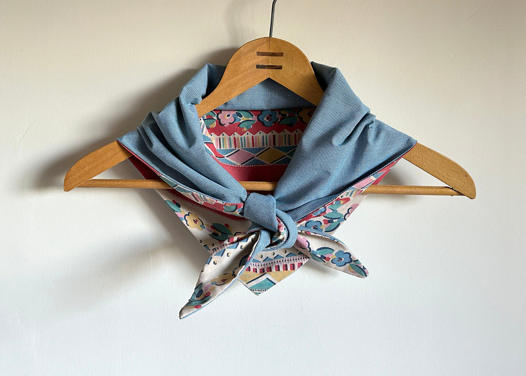 This mix and match triangle scarf has been handmade out of vintage material off-cuts- a red patterned fabric one side and a small blue gingham on the other, it is one of a kind and great for all seasons!