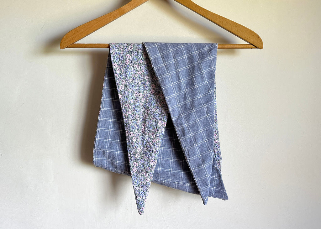 This pretty triangle scarf has been handmade out of vintage material, a dainty floral to one side and a complimentary purple check on the other, it is one of a kind and great for all seasons.
