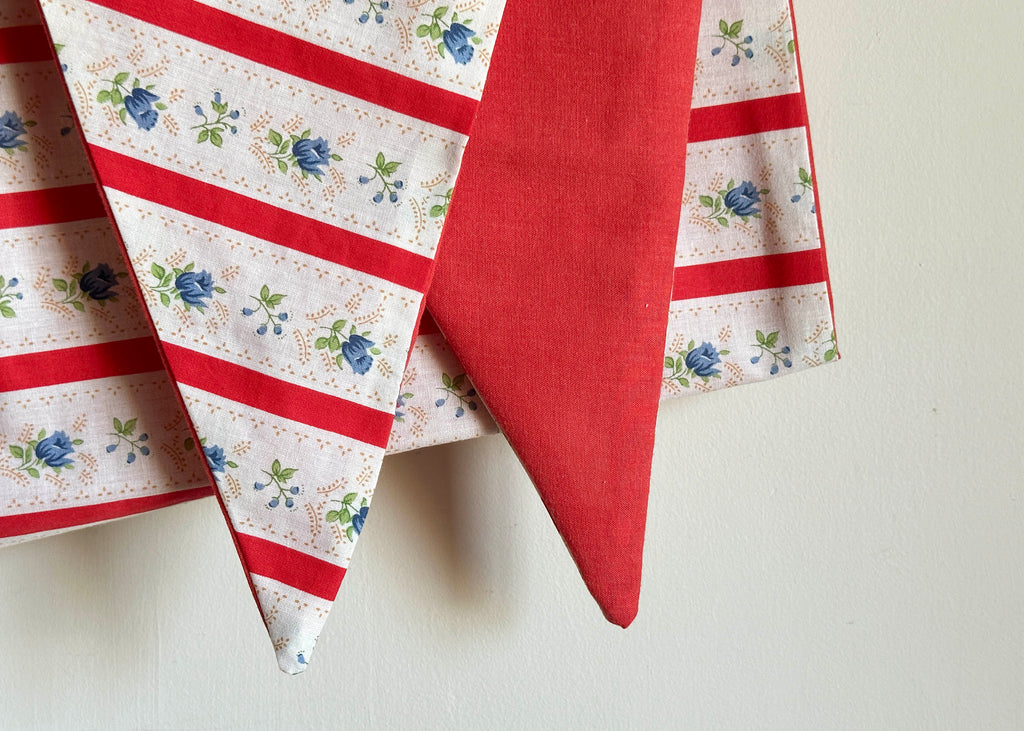 This mix and match triangle scarf has been handmade out of vintage material off-cuts; a red patterned fabric one side and a plain red on the other, it is one of a kind and great for all seasons!