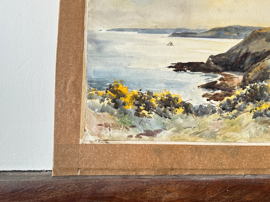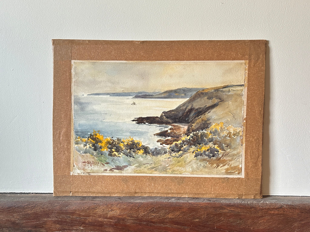 The original painting depicts a seascape of imposting cliffs which meet still water, there is a small sail boat in the background and yellow gorse flowers in the foreground.