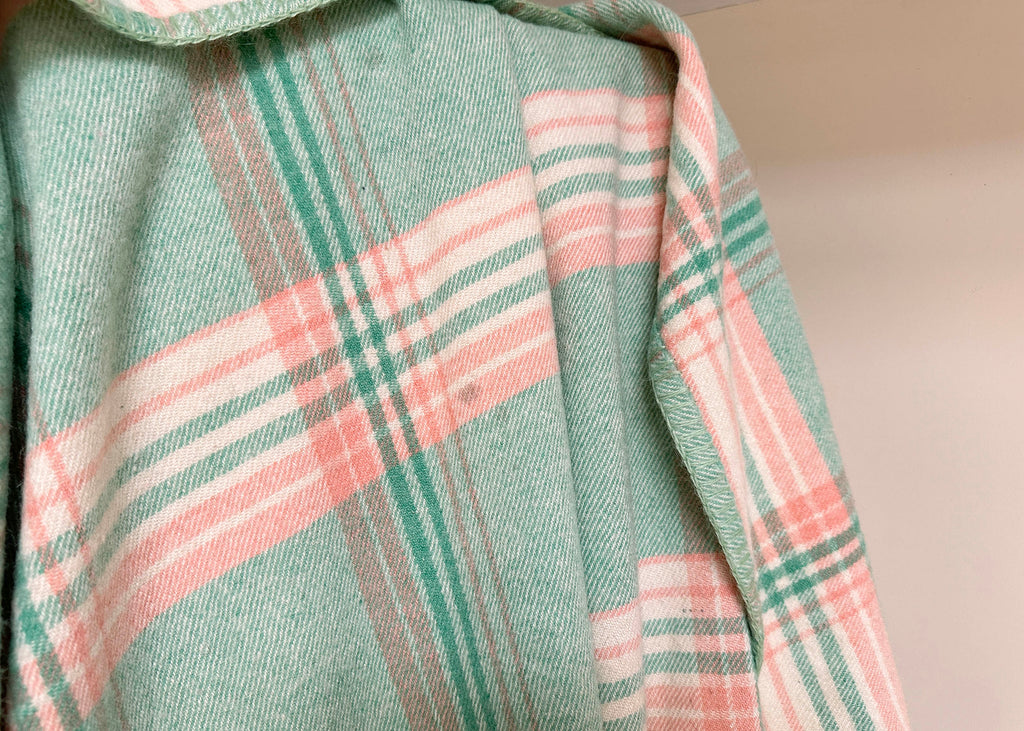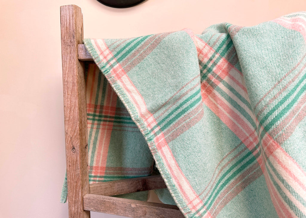Hand woven in Wales, this beautiful wool blanket is a green and pink checkered pattern and makes a great piece of vintage decor for any home.