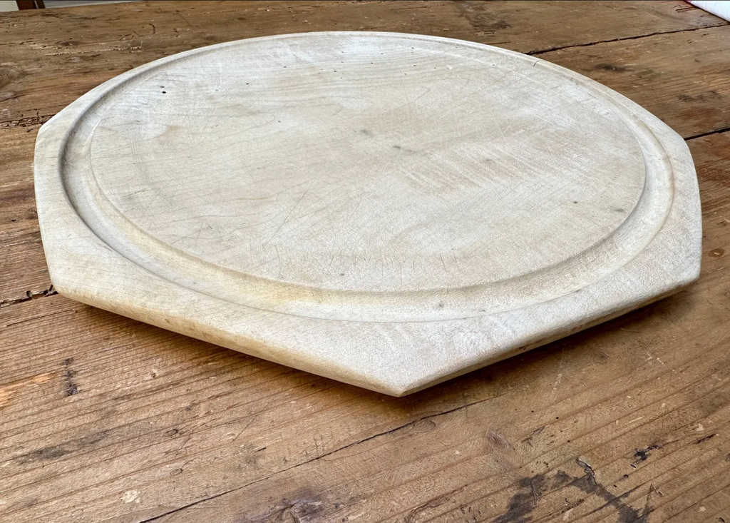 Fully functional and in very good condition, this beautiful old bread board has been made out of a sycamore slab, has octagonal sides and a carved round detail to the front.