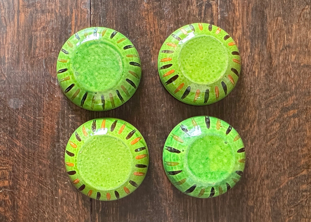 Sold as a set of four, these vibrant clay bowls have a striking green glaze with brown and orange accents throughout.